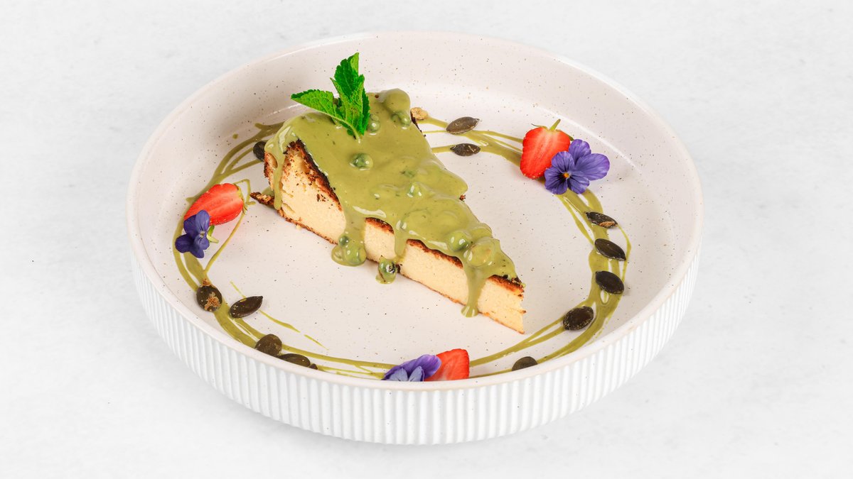 Cheesecake z belo čokolado, bučnim oljem, bučnimi semeni in liofiliziranimi borovnicami V ceno jedi je všteto doplačilo 0.50 eur za biorazgradljivo embalažo
