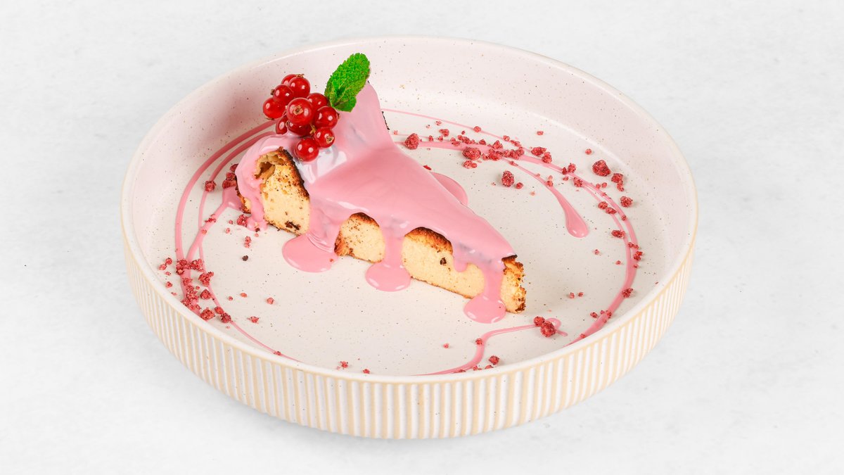 Cheesecake z ruby čokolado in malinovim drobljencem V ceno jedi je všteto doplačilo 0.50 eur za biorazgradljivo embalažo