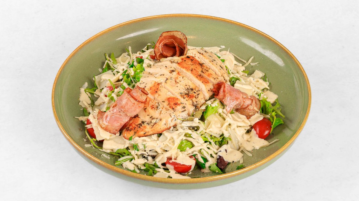 Piščančji file, mešanica mladih solat, rukola, parmezan, panceta, češnjev paradižnik, preliv V ceno jedi je všteto doplačilo 0.50 eur za biorazgradljivo embalažo