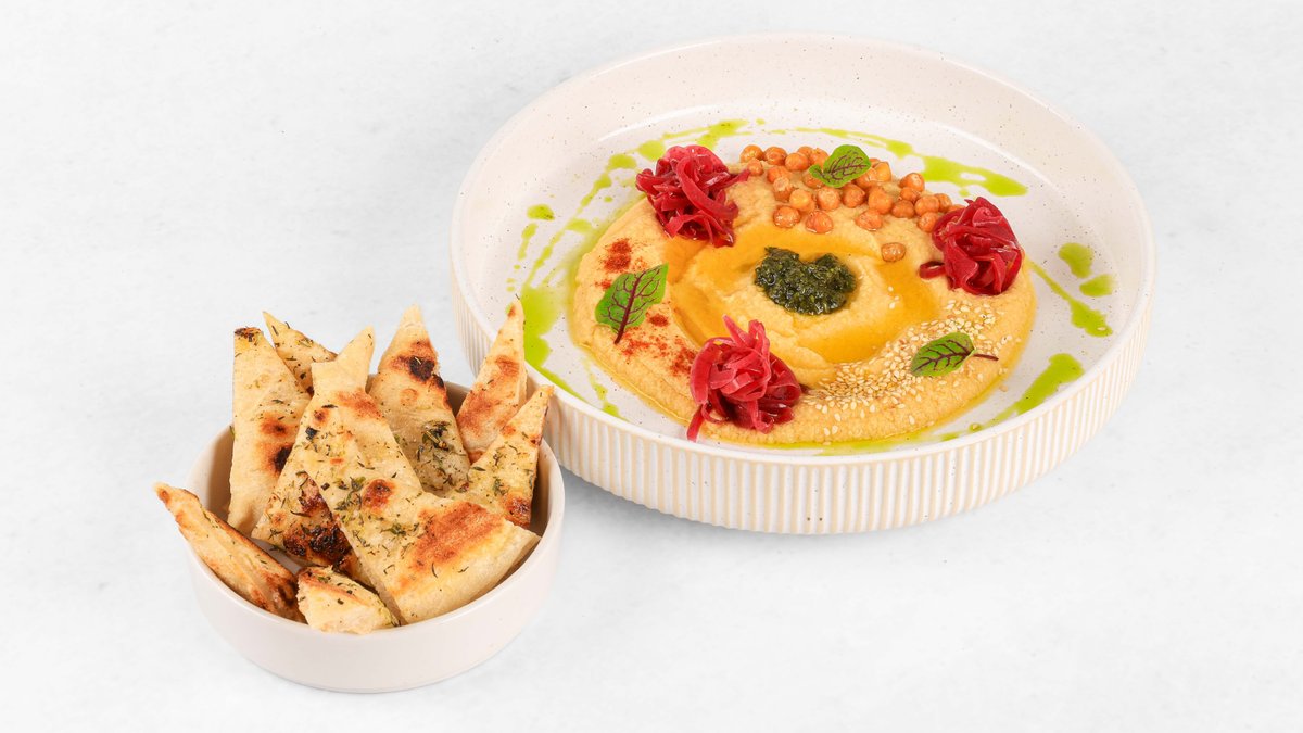 Hummus čičerike, sezam, čili, hrustljave čičerike z začimbami, vložena čebula, čemažev pesto, pita kruh V ceno jedi je všteto doplačilo 0.50 eur za biorazgradljivo embalažo