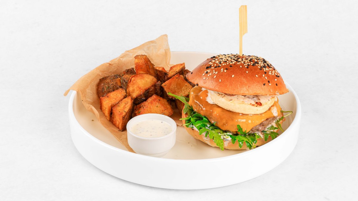 100% zorjena govedina (SLO), brioche bombetka z drožmi, mladi sir, rukola, omaka s tartufi, krompirček V ceno jedi je všteto doplačilo 0.50 eur za biorazgradljivo embalažo