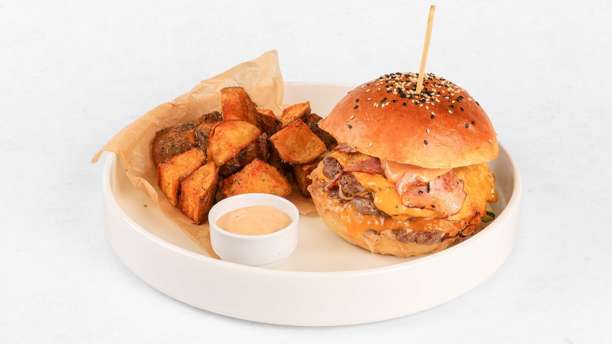 100% zorjena govedina (SLO), brioche bombetka z drožmi, sir cheddar, kumarice, slanina, omaka, krompirček V ceno jedi je všteto doplačilo 0.50 eur za biorazgradljivo embalažo