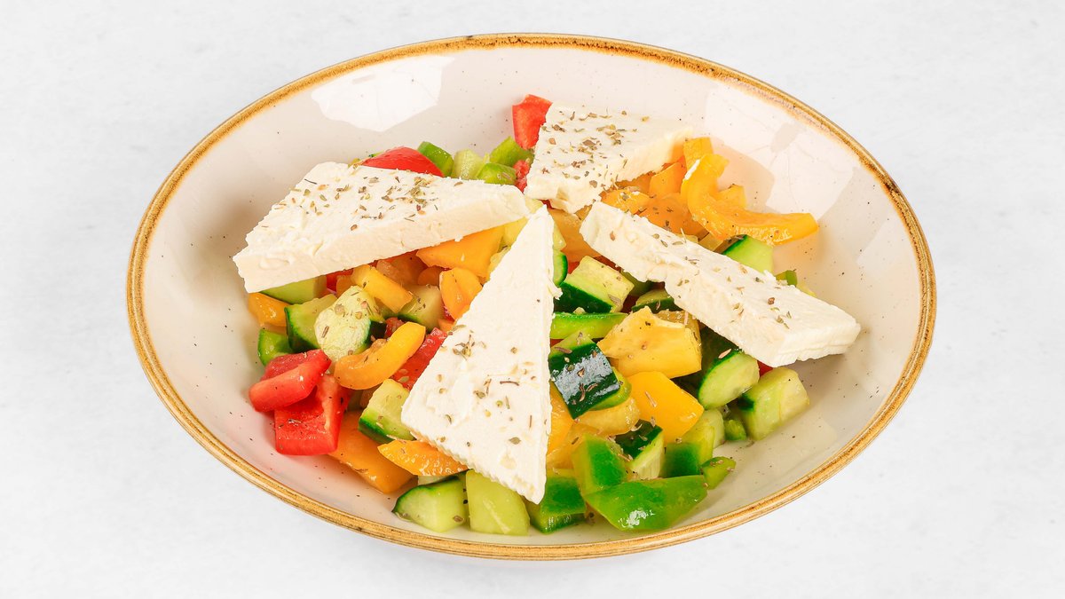 Paradižnik, paprika, kumare, olive, feta, rdeča čebula, origano V ceno jedi je všteto doplačilo 0.50 eur za biorazgradljivo embalažo