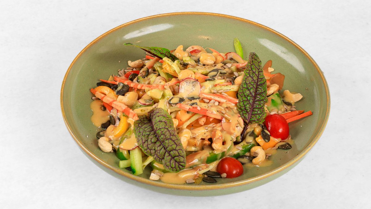 Kumarice, paprika, por, mlada čebula, češnjev paradižnik, korenje, redkvice, sončnična semena, bučna semena, indijski oreščki, preliv iz medu in gorčice V ceno jedi je všteto doplačilo 0.50 eur za biorazgradljivo embalažo