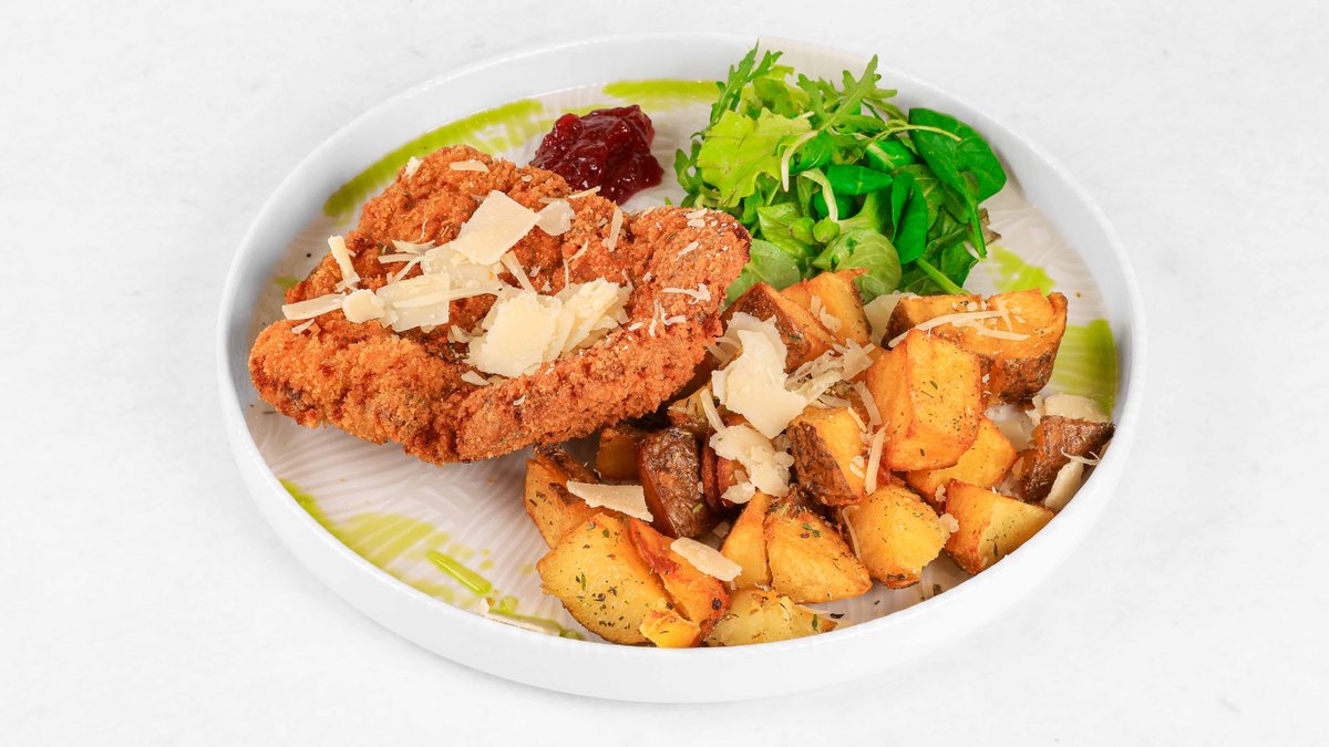 Telečji hrbet, domači krompirček, solatka, brusnična marmelada V ceno jedi je všteto doplačilo 0.50 eur za biorazgradljivo embalažo