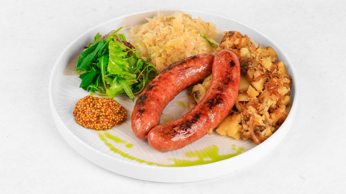 Kranjska klobasa, pražen krompir s čebulo, kislo zelje, ocvirki, gorčica V ceno jedi je všteto doplačilo 0.50 eur za biorazgradljivo embalažo