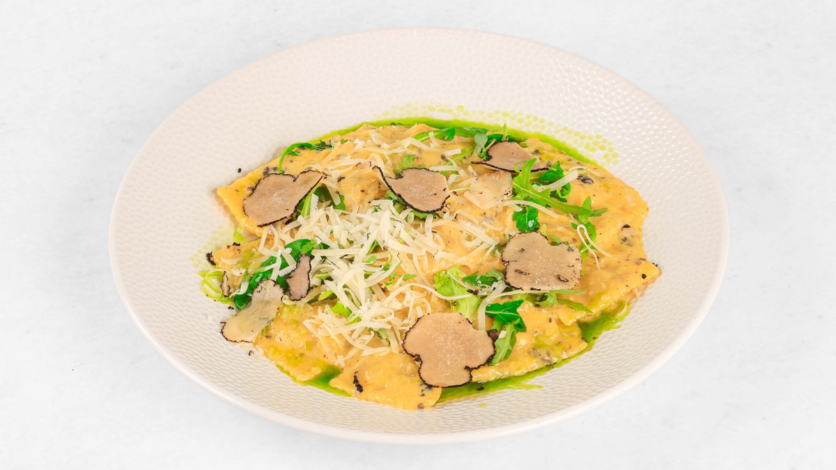 Sveži ravioli z jurčki in tartufi, tartufova pasta, parmezan, sveže ribani tartufi V ceno jedi je všteto doplačilo 0.50 eur za biorazgradljivo embalažo