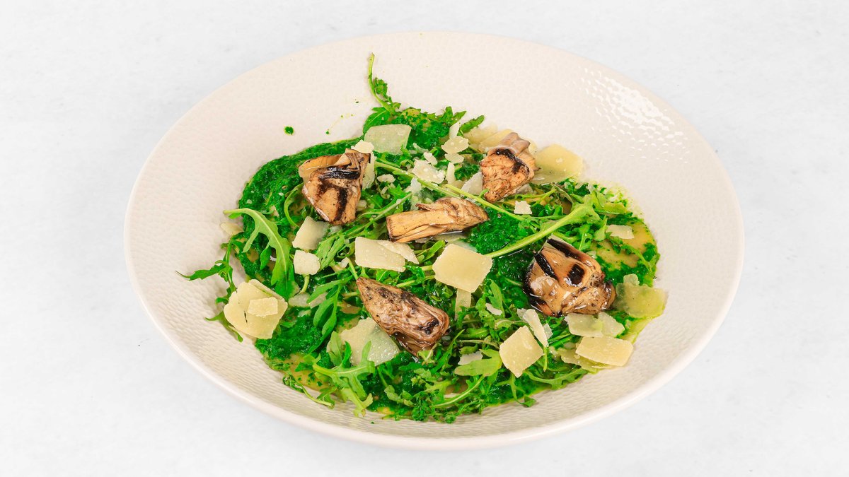 Pelati, artičoke, melancani, čebula, gobe, rukola, dimljena skuta V ceno jedi je všteto doplačilo 0.50 eur za biorazgradljivo embalažo