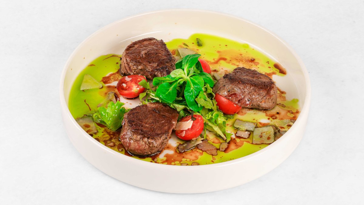 Goveji biftek, rukola, češnjev paradižnik, parmezan, olivno olje, balzamični kis V ceno jedi je všteto doplačilo 0.50 eur za biorazgradljivo embalažo