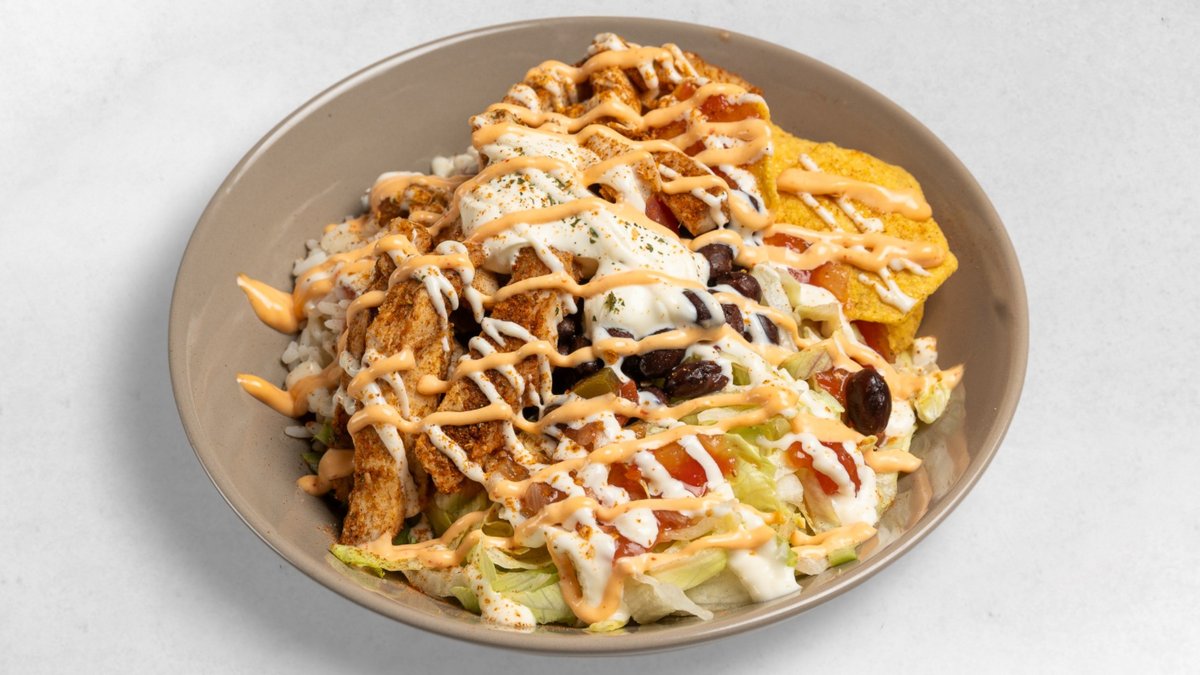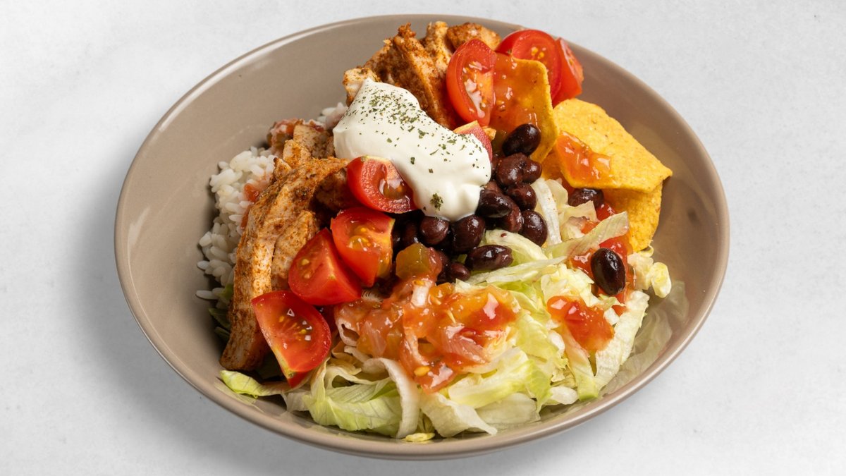 Sočna popečena piščančja prsa marinirana v fajitas začimbah, hrustljavi tortilja čips, limetin riž, mehiška paradižnikova salsa, črni fižol, sveža ledenka solata, crème fraîche in preliv iz kremaste chipotle salse