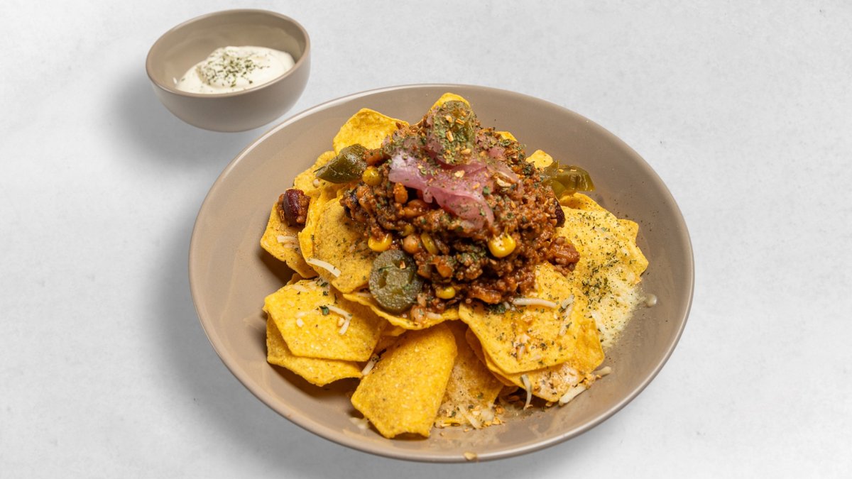 Hrustljav tortilja chips z mehiško začinjenim Chilli con Carnejem in mešanico topljenega cheddar sira, crème fraîche ter mlade čebule