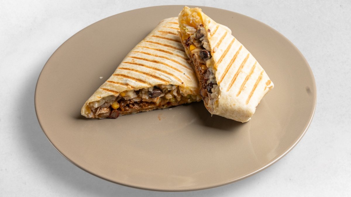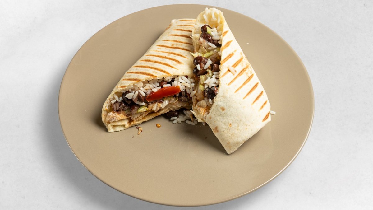 Sočna popečena piščančja prsa marinirana v fajitas začimbah s cheddar sirom, crème fraîche, črnim fižolom, svežo ledenka solato, limetinim rižom in kremasto česnovo salso. Zavita v veliko mehko pšenično tortiljo