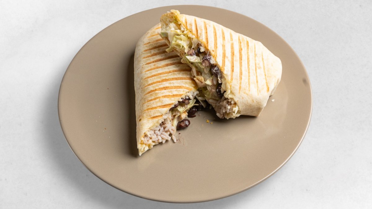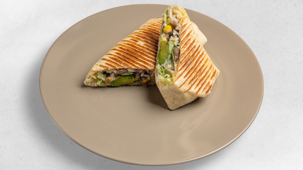 Sveže rezine zelenega avokada s cheddar sirom, crème fraîche, črnim fižolom, svežo ledenka solato, limetinim rižem in koruzo. Zavite v veliko mehko pšenično tortiljo
