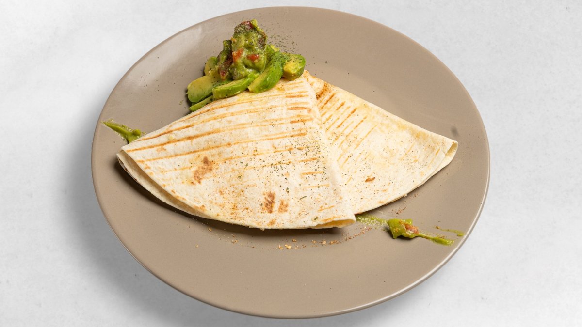 Pečena pšenična tortilja s svežimi zelenimi rezinami avokada, crème fraîche in cheddar sirom