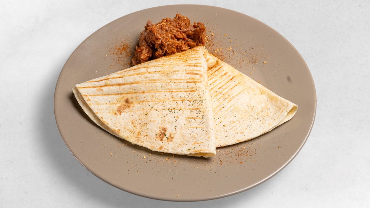 Pečena pšenična tortilja z natrgano svinjino v blagih mehiških začimbah, crème fraîche in cheddar sirom