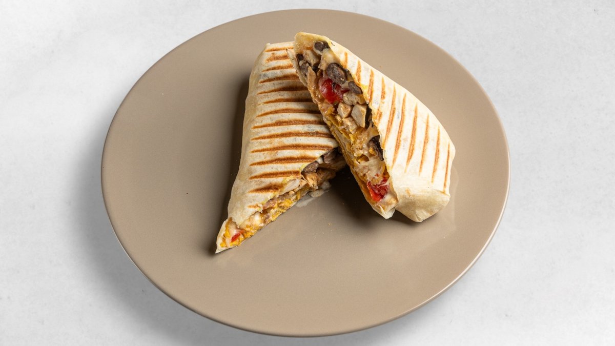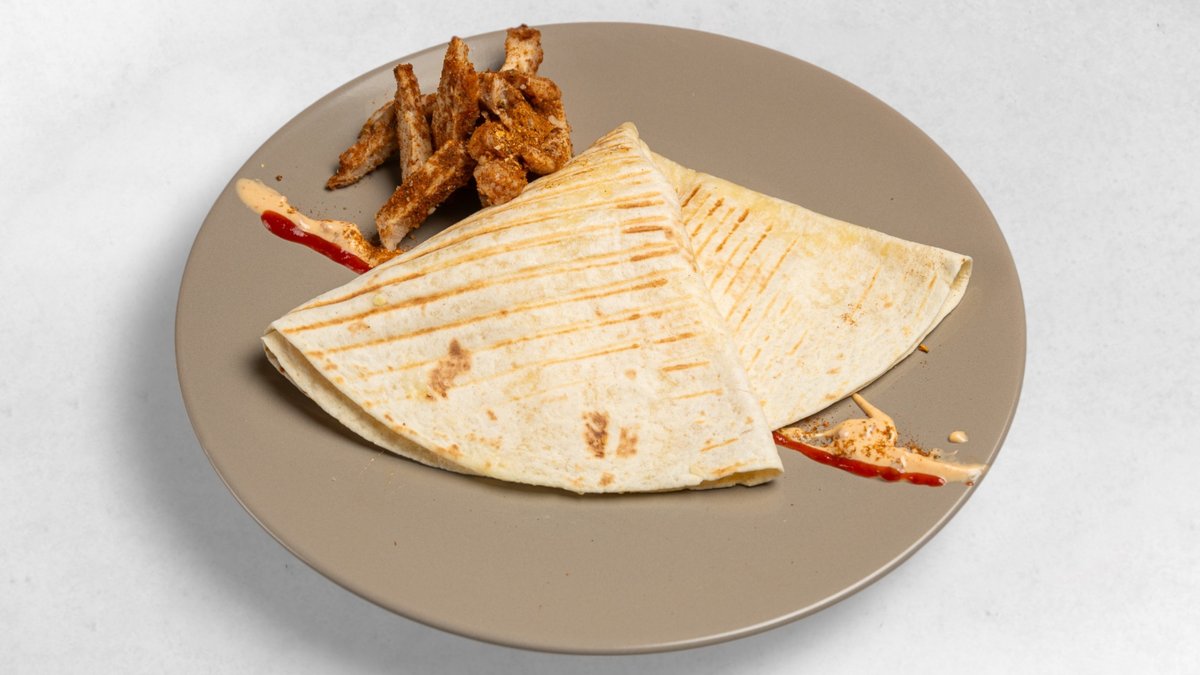 Pečena pšenična tortilja s sočnimi popečenimi piščančjimi prsmi mariniranimi v fajitas začimbah, crème fraîche in cheddar sirom