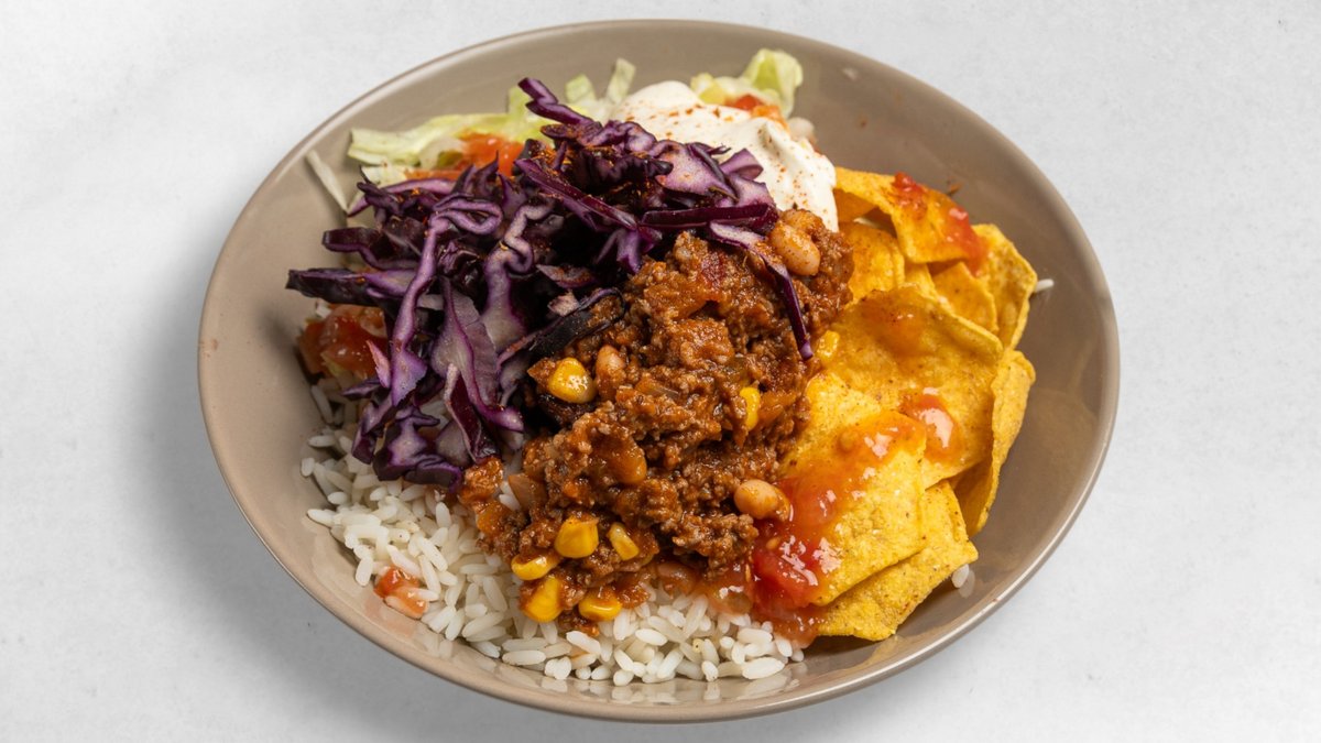 Mehiško začinjen Chilli con Carne, hrustljavi tortilja čips, limetin riž, mehiška paradižnikova salsa, črni fižol, sveža ledenka solata, crème fraîche in vloženo rdeče zelje