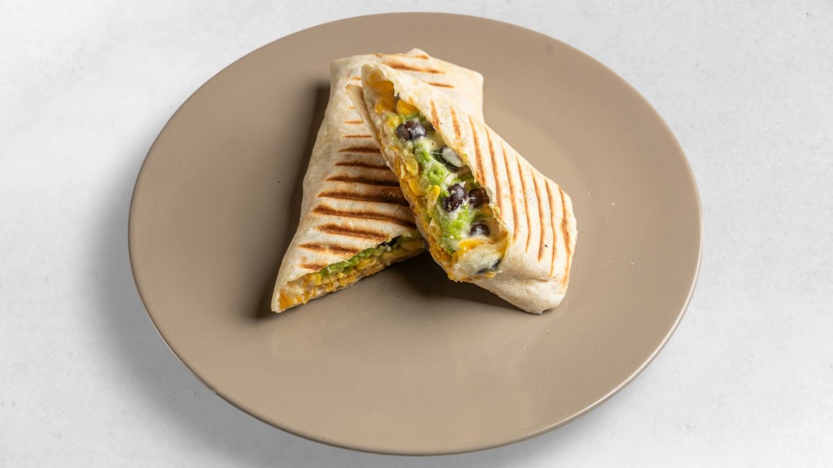 Rezine svežega avokada s cheddar sirom, crème fraîche, črnim fižolom, sladko koruzo in kremasto česnovo salso. Zavite v veliko mehko pšenično tortiljo