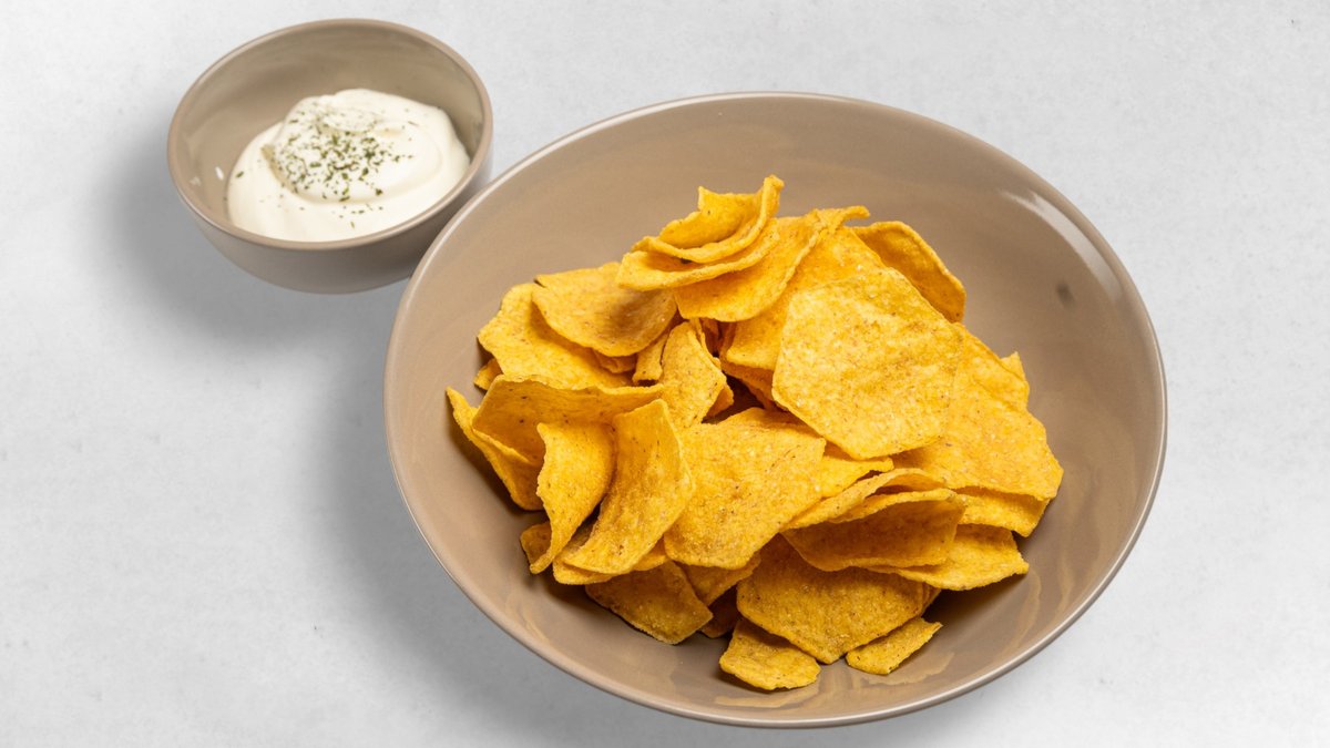 Naši hrustljavi tortilja čips s stopljenim cheddar sirom, crème fraîche in mlado čebulo