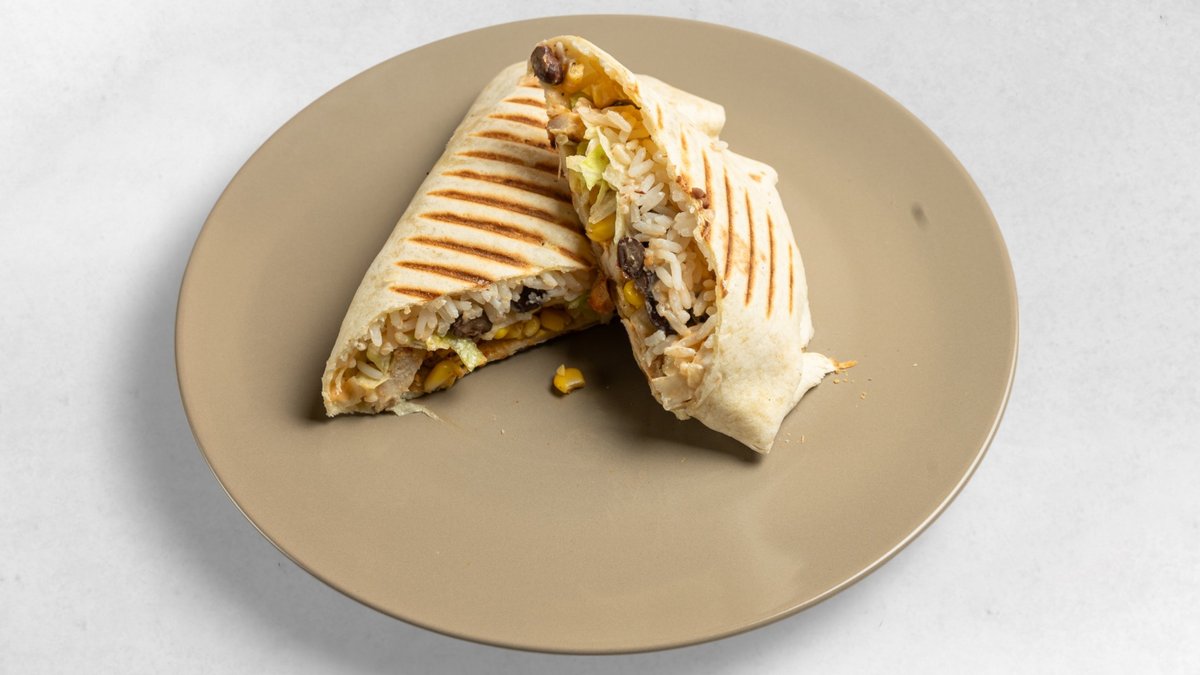 Mehiško začinjen Chilli con Carne s cheddar sirom, crème fraîche, črnim fižolom, svežo ledenka solato, limetinim rižem in koruzo. Zavit v veliko mehko pšenično tortiljo