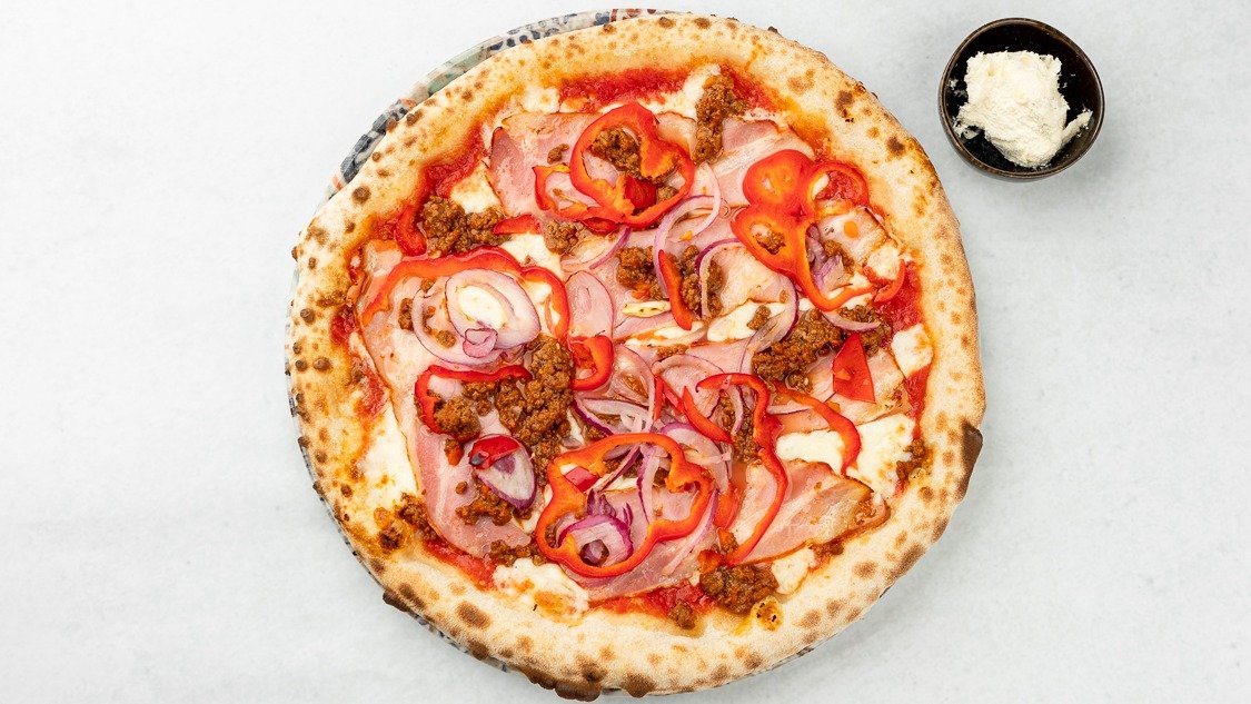 Pelati San Marzano, Fior di Latte, sveža paprika, rdeča čebula, domača slanina, mleto meso, kajmak