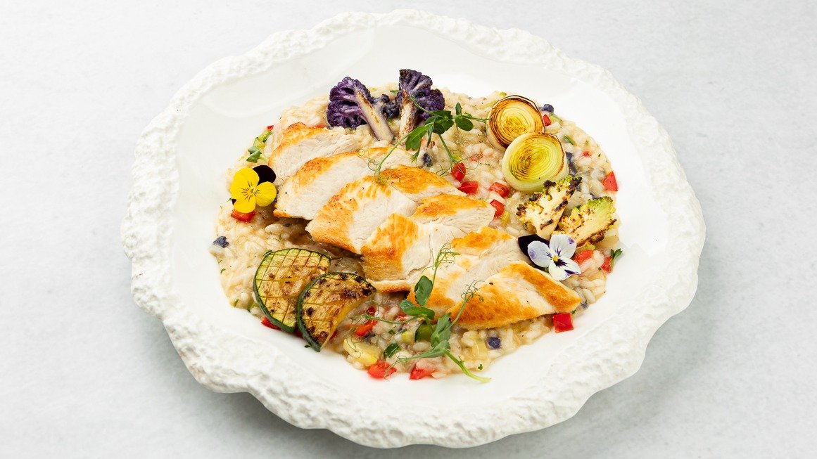 Rižota s slovenskim piščancem, bučkami, porom, šparglji