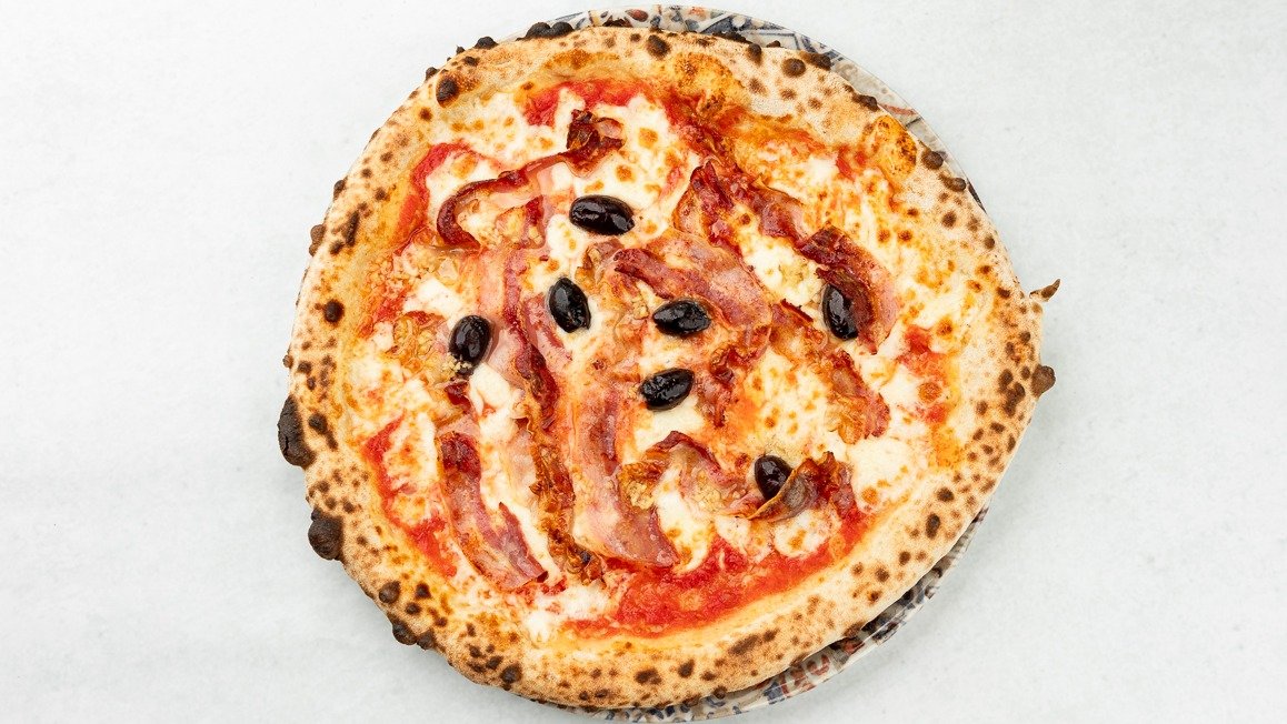 Pelati San Marzano, Fior di Latte, domača panceta, rdeča čebula, tržaška omaka, črne olive