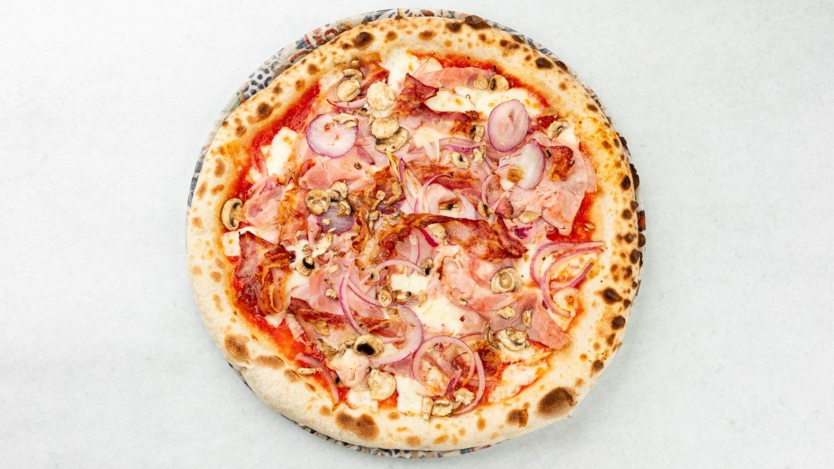 Pelati San Marzano, Fior di Latte, kuhan pršut, domača panceta, rdeča čebula, sveži šampinjoni