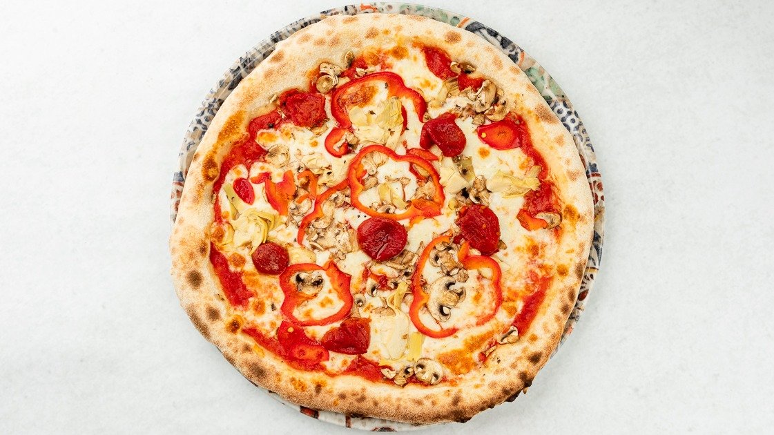 Pelati San Marzano, Fior di Latte, artičoke, sveži šampinjoni, rdeča paprika, vložen paradižnik