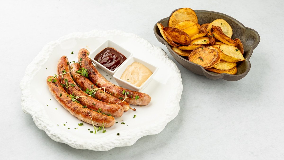 Pivska klobasica polnjena s sirom, omaka, priloga