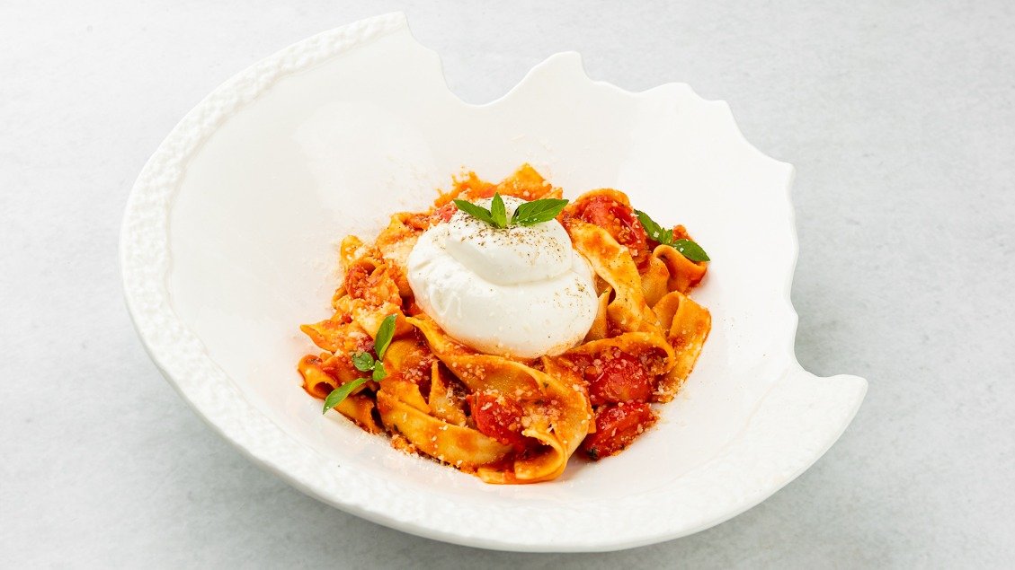 Domača pašta s paradižnikom San Marzano, burrata, bazilika