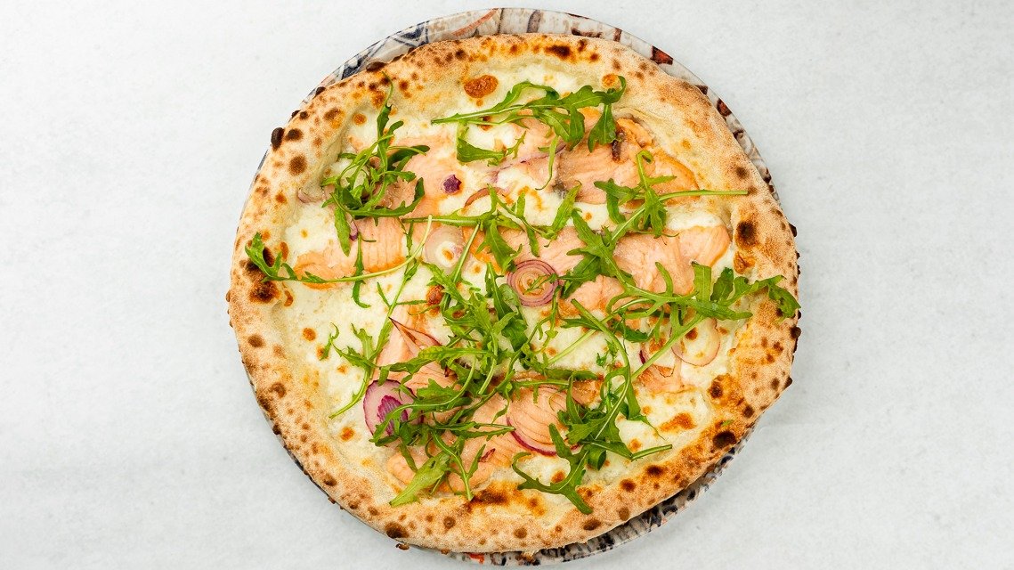 Fior di Latte, rdeča čebulca, dimljen losos, rdeči kaviar, rukola, istrsko olivno olje