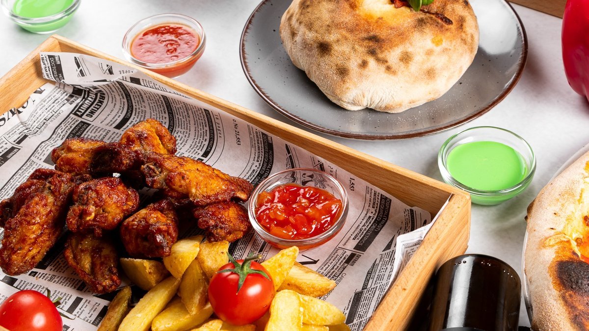 Ocvrte marinirane perutničkev mešanici mehiških začimb, ocvrti krompirjevi krhlji in omaka V ceno jedi je všteto doplačilo 0.90 eur za biorazgradljivo embalažo