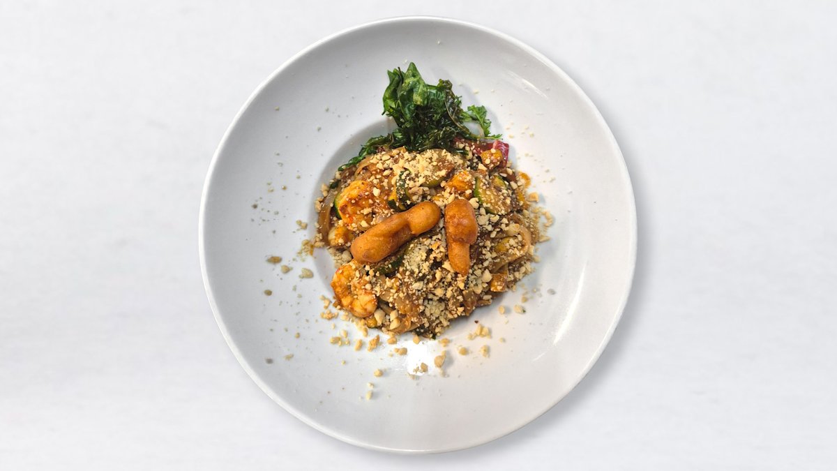 Riževi rezanci z rakci, zelenjavo, jajcem in arašidi