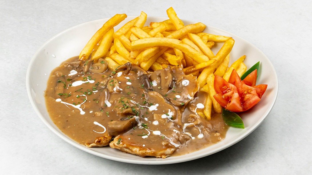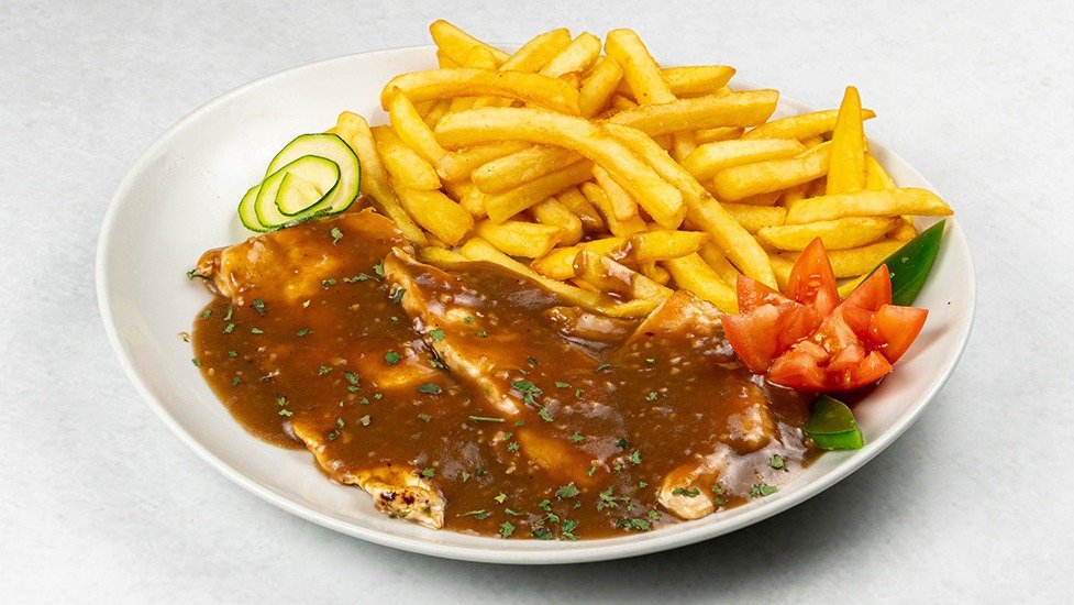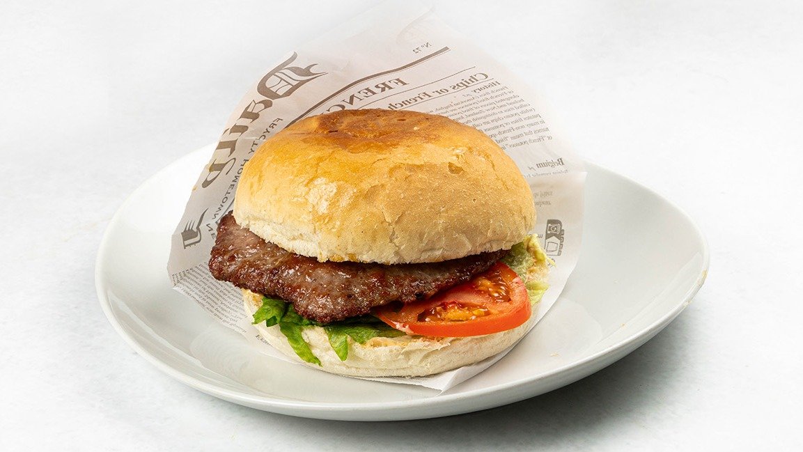 Bombeta z sezamom, mešano mleto meso, domača omaka, black jack omaka, zelena solata, paradižnik, pomfri, dunajski piščančji file (2x)
