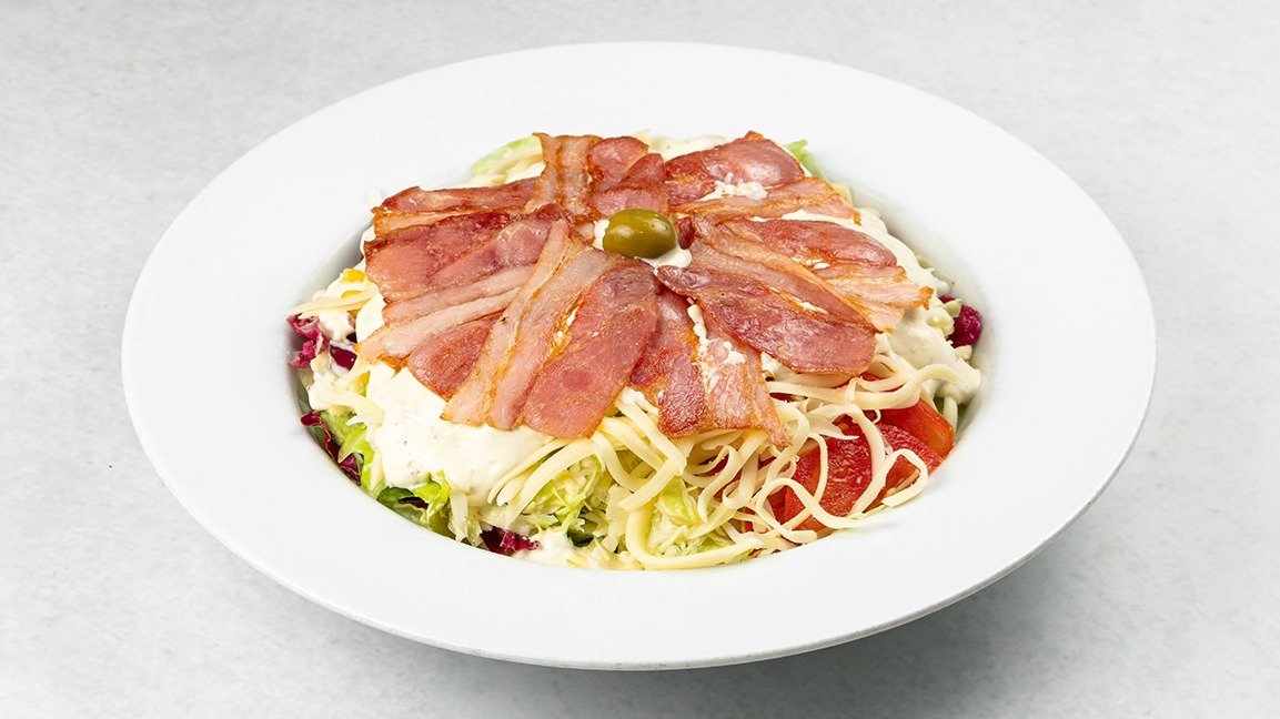 Zelena solata, radič, zelje, paradižnik, fižol, koruza, oliva, sir, popečena slanina, tatarska omaka