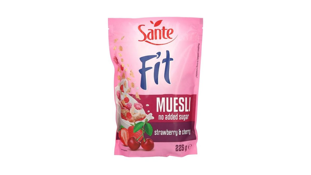 Polnozrnati kosmiči brez dodanega sladkorja Fit z jagodo in češnjo, Sante (225 g)