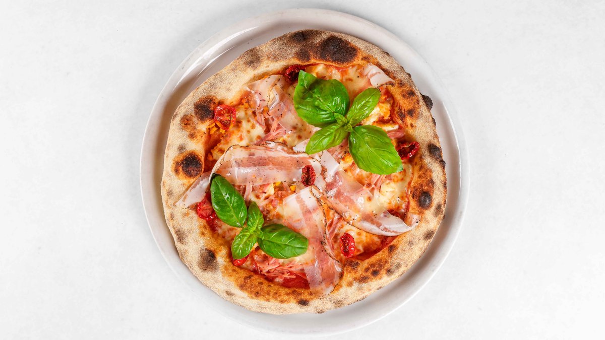 Pelati San Marzano D.O.P., mozzarella Campana Fior di Latte D.O.P., nduja, guanciale, kuhan pršut, suh paradižnik, kisla smetana, kuhano jajce, bazilika V ceno jedi je všteto doplačilo 0.50 eur za biorazgradljivo embalažo