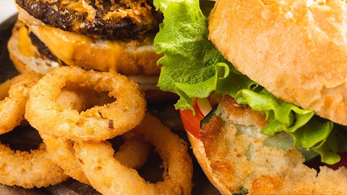 Bombeta s sezamom, goveje meso, feta sir, majoneza, solata, paradižnik, ocvrta čebula, pohane bučke