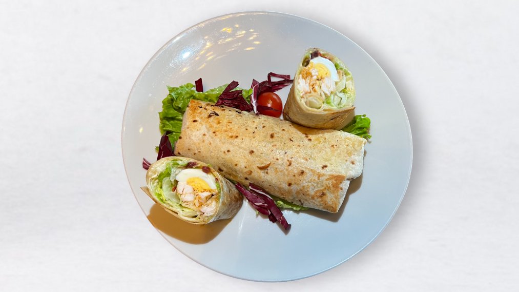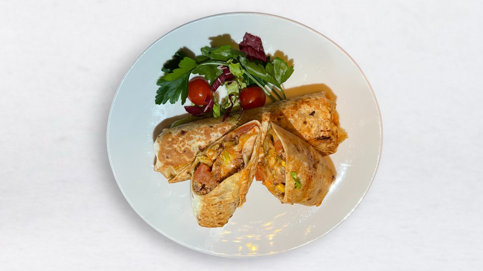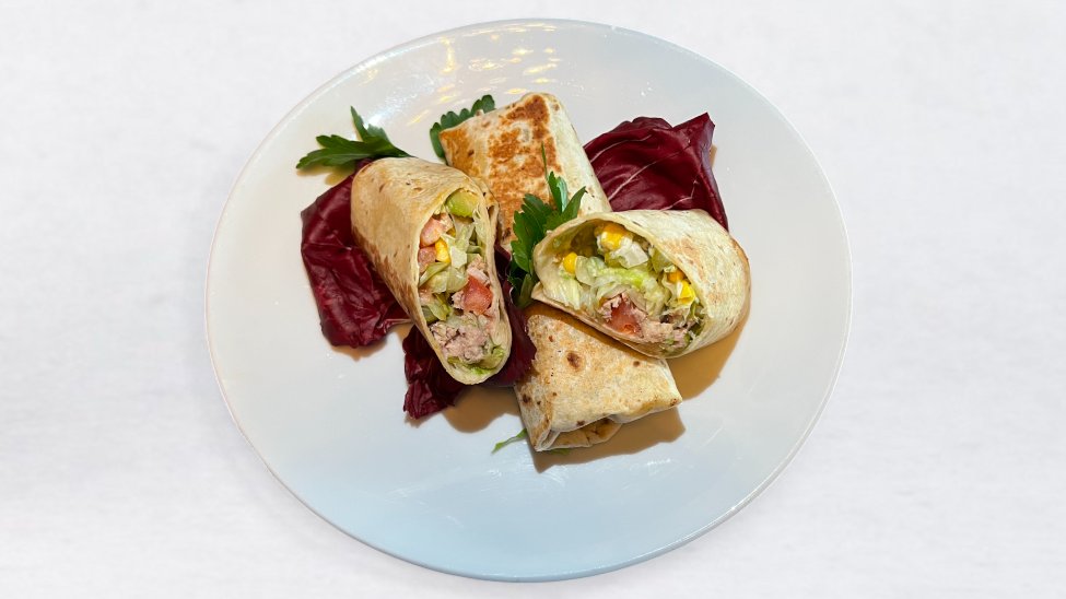 Tortilja, tuna, rdeča čebula, zelena solata, koruza, paprika, paradižnik, kisle kumarice, šefova omaka, avokado