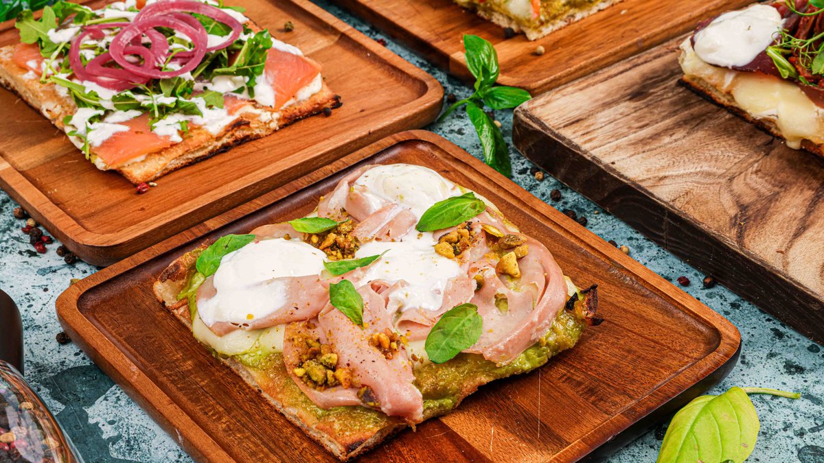 Hišna pistacijeva krema, mozzarella fior di latte, mortadella, sir stracciatella, prepražena pistacija, sveža bazilika, ekstra deviško olje Monte Rosso
