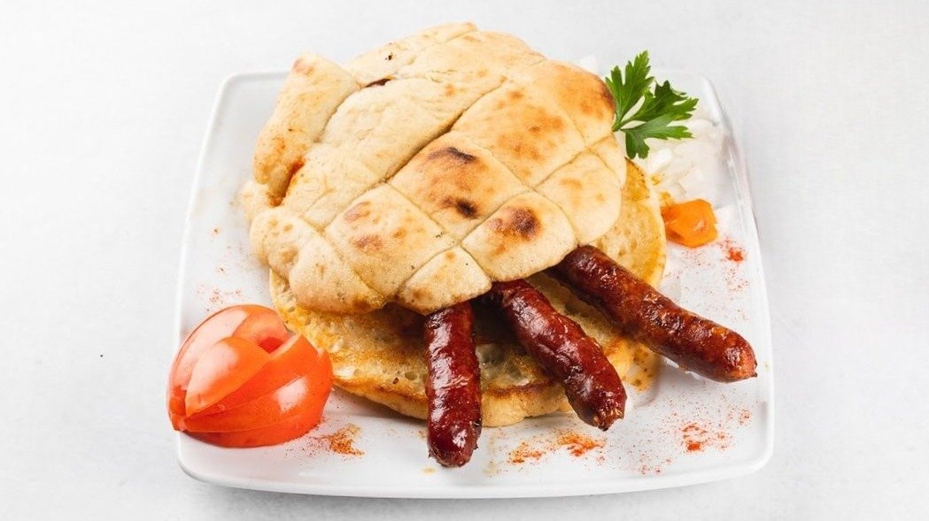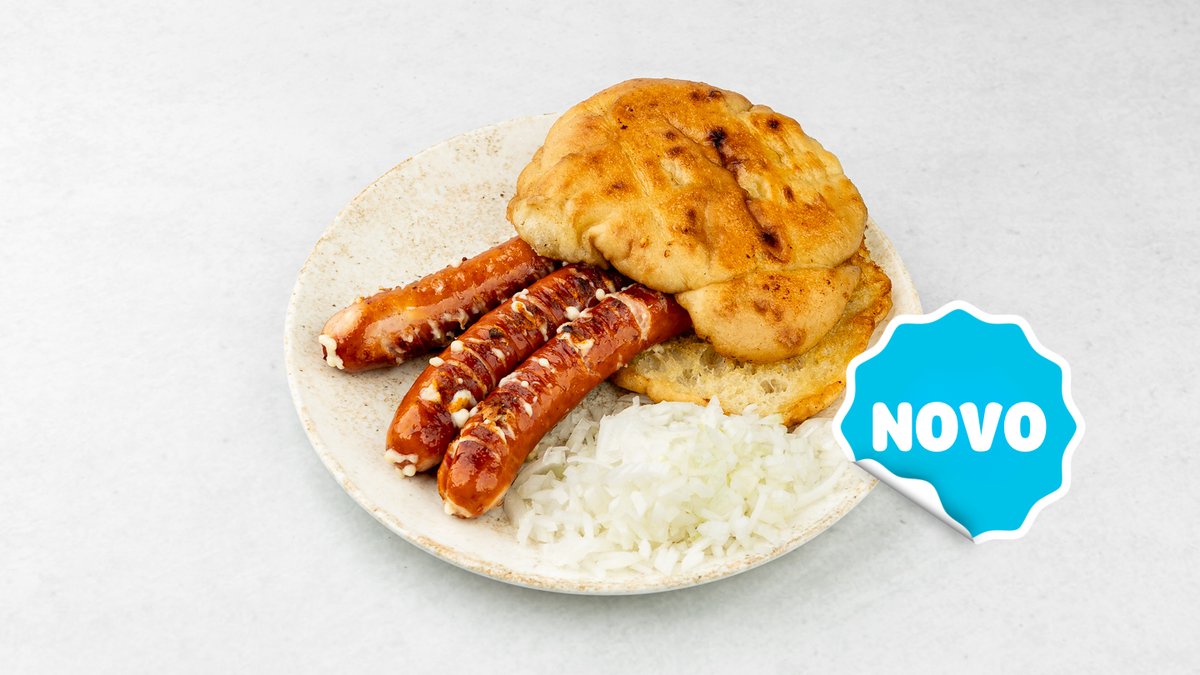 Klobase pečene na lesenem oglju (Halal), lepinja, čebula