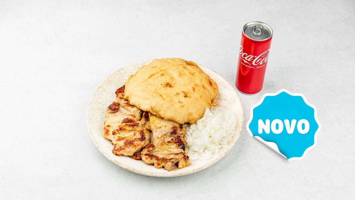 Pečeni marinirani kosi piščančjega fileja, lepinja, čebula, pijača po izbiri