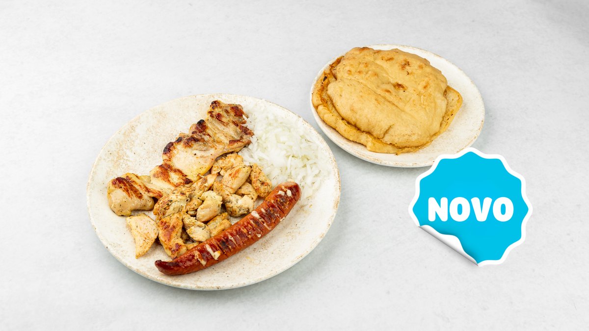 1x piščančja klobasa, 2x stegna, piščančje krpice, čebula, lepinja, pijača po izbiri