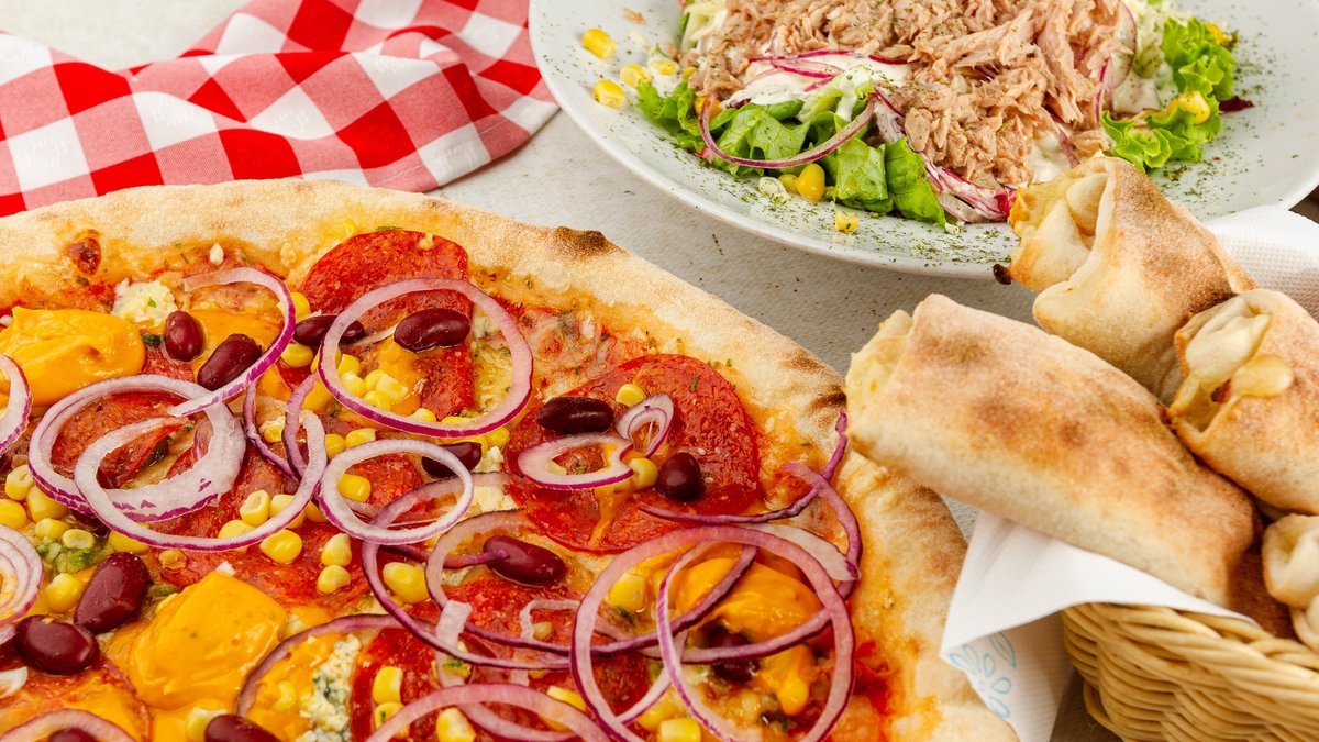 Pelati, sir, suha salama, kumarice, čebula, gobe, origano in Coca-Cola 0.5 l