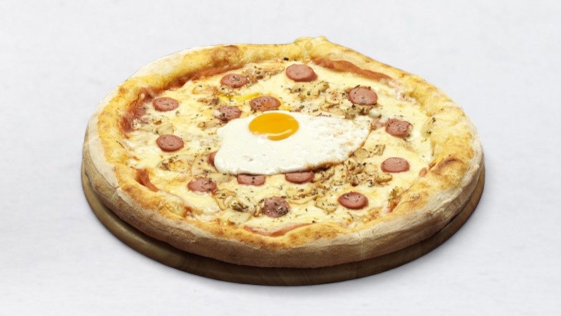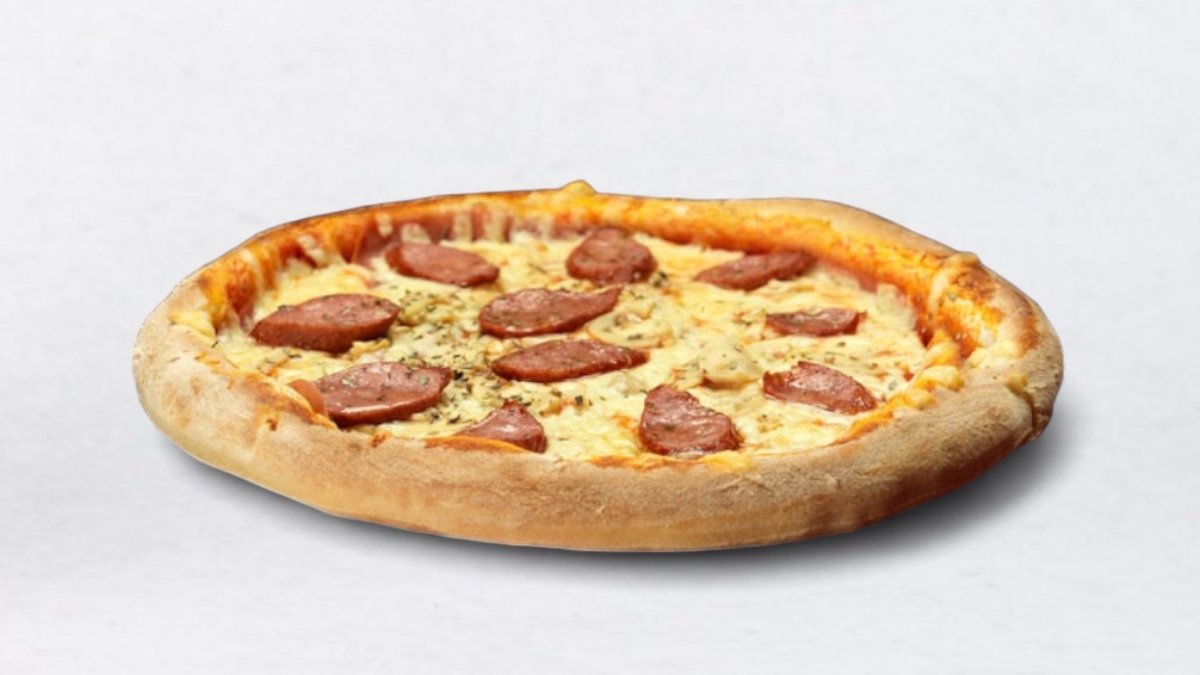Pelati, sir, šunka, gobe, hrenovke, jajce, origano V ceno jedi je všteto doplačilo 0.50 eur za biorazgradljivo embalažo