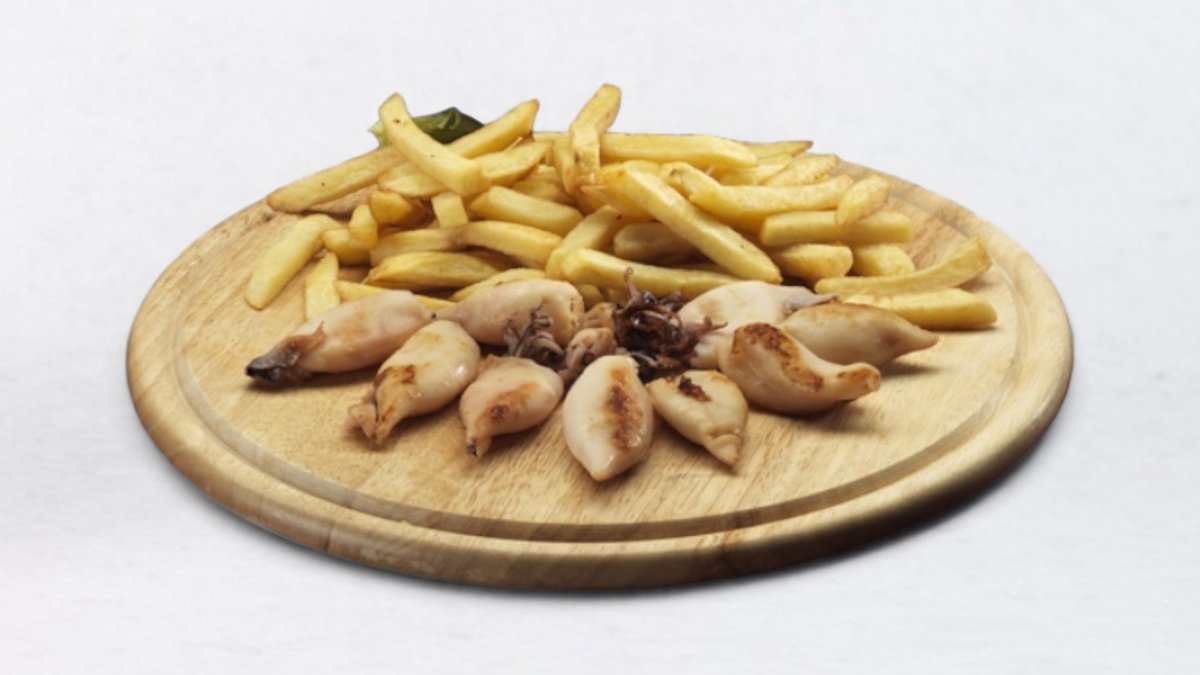 Lignji na žaru, tržaška omaka, pomfri V ceno jedi je všteto doplačilo 0.50 eur za biorazgradljivo embalažo