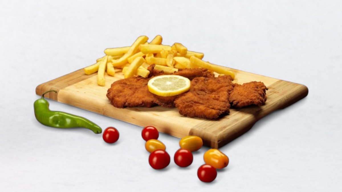 Marinirane piščančje rezine pečene na žaru, pomfri V ceno jedi je všteto doplačilo 0.50 eur za biorazgradljivo embalažo