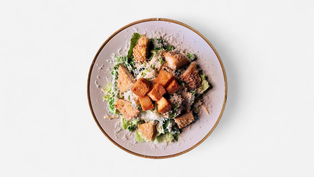 Solata Romana, krutoni, parmezan, hišni Caesar preliv in Panko ocvrt piščanec. V ceno jedi je všteto doplačilo 0.50 eur za biorazgradljivo embalažo.