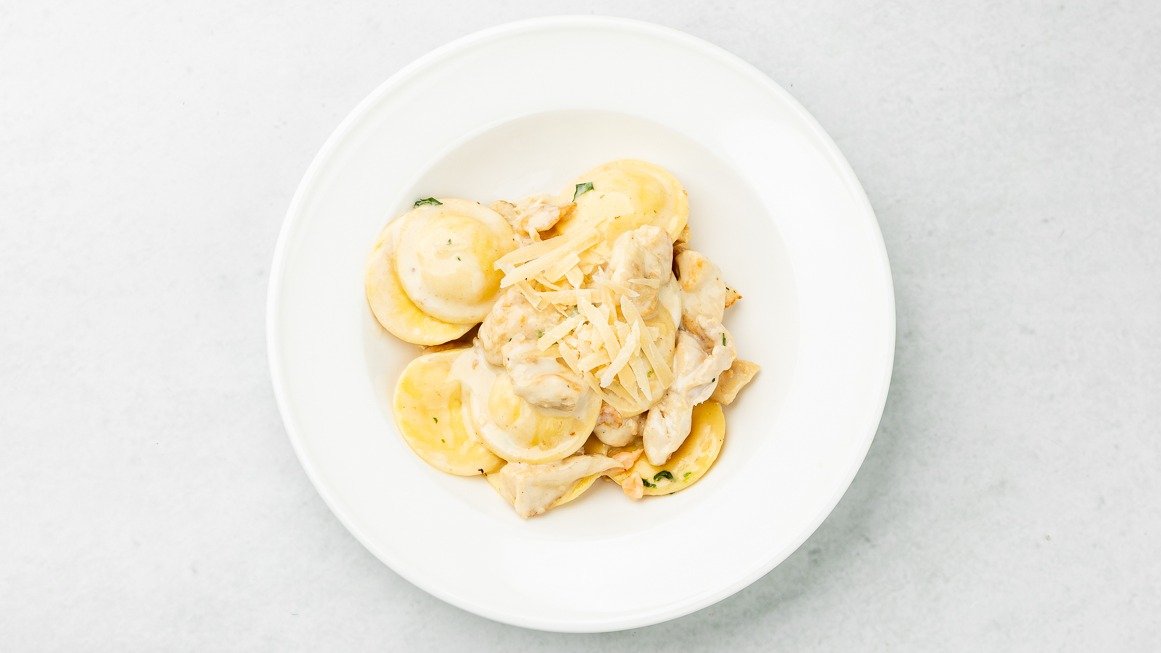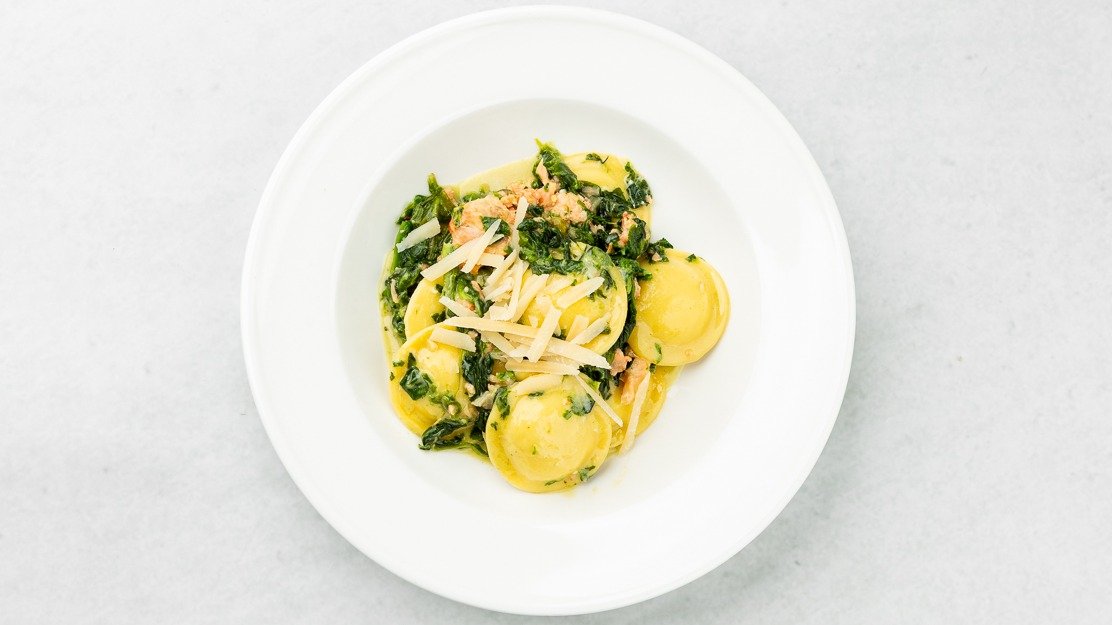 Sirovi ravioli z dimljenim lososom in špinačo v kremni omaki